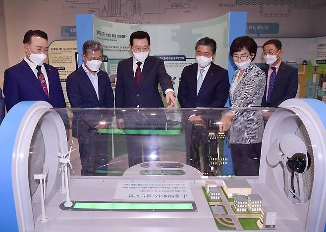 사진은 에너지파크 전시관 둘러보는 이용섭 광주시장 및 관계자들. 2021.9.28
