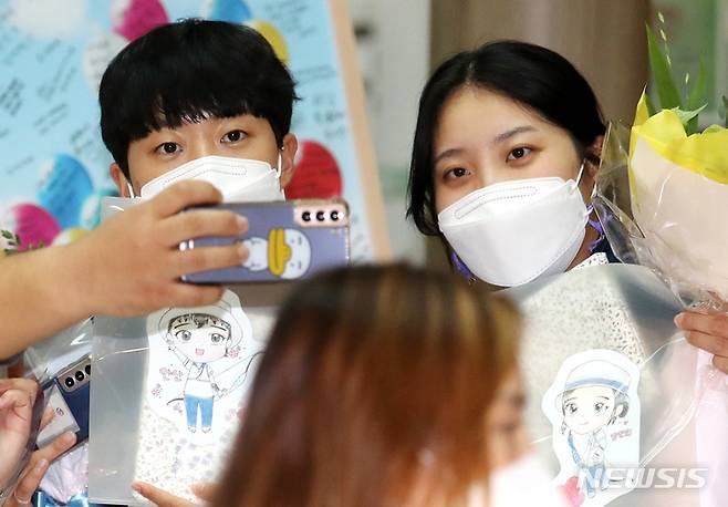 [인천공항=뉴시스] 조성우 기자 = 대한민국 양궁 대표팀 안산, 장민희가 28일 오후 미국에서 열린 세계선수권대회 일정을 마치고 인천국제공항 제1여객터미널을 통해 귀국해 기념촬영을 하고 있다. 2021.09.28. xconfind@newsis.com