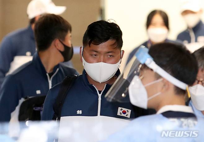 [인천공항=뉴시스] 조성우 기자 = 대한민국 양궁 대표팀 김우진이 28일 오후 미국에서 열린 세계선수권대회 일정을 마치고 인천국제공항 제1여객터미널을 통해 귀국하고 있다. 2021.09.28. xconfind@newsis.com