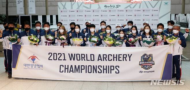 [인천공항=뉴시스] 조성우 기자 = 대한민국 양궁 대표팀이 28일 오후 미국에서 열린 세계선수권대회 일정을 마치고 인천국제공항 제1여객터미널을 통해 귀국해 기념촬영을 하고 있다. 2021.09.28. xconfind@newsis.com