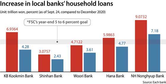 As of Sept. 24, NH Nonghyup Bank issued 7.18 percent more loans this year compared to all of 2020. During the same period, Hana Bank issued 4.77 percent more loans, KB Kookmin Bank 4.29 percent, Woori Bank 3.61 percent and Shinhan Bank 2.43 percent.
