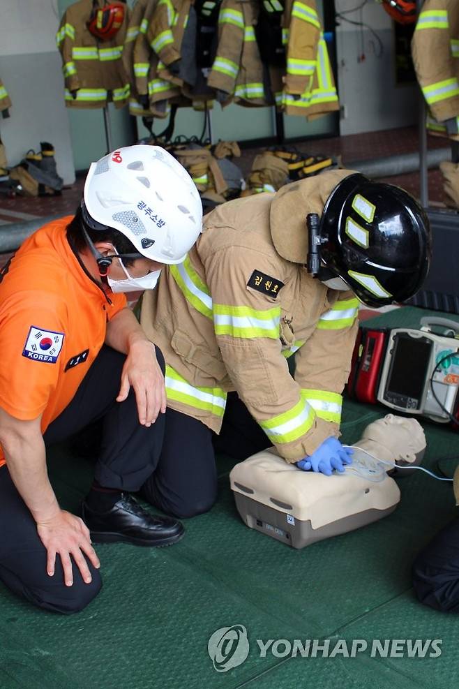 (광주=연합뉴스) 광주 광산소방서 청사에서 지난 27일 '펌뷸런스' 대원 응급처치 능력 향상 교육이 열리고 있다. 펌뷸런스는 소방 펌프차(Pump)와 구급차(Ambulance)를 뜻하는 영어단어의 합성어로 구급차 도착 전까지 응급처치를 시행하거나 구급대를 지원하는 소방차를 뜻한다. 기본 심폐소생술과 자동심장충격기 사용법을 익히는 교육이 이뤄졌다. 2021.9.28 [광주 광산소방서 제공. 재판매 및 DB 금지]