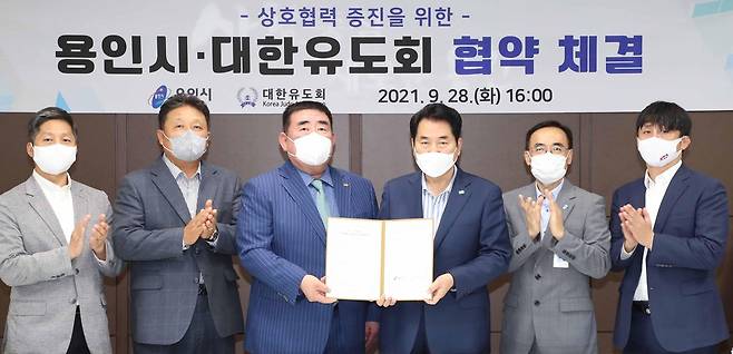 (용인=연합뉴스) 28일 경기 용인시청에서 열린 용인시-대한유도회 상호협력 증진을 위한 업무 협약식에서 백군기 시장, 조용철 대한유도회장 등 참석자들이 기념 촬영하고 있다. 2021.9.28