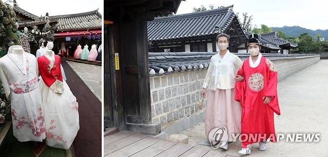 (전주=연합뉴스) 최영수 기자 = 관광객들이 한복을 입고 28일 전북 전주시 한옥마을 정취를 즐기고 있다. 2021.9.28