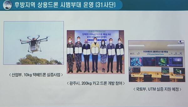 여기에다 고흥 드론센터서 후방지역 상용드론 시범부대(31사단) 운영, 정부부처-지차체 드론 개발 협력도 소개했다.