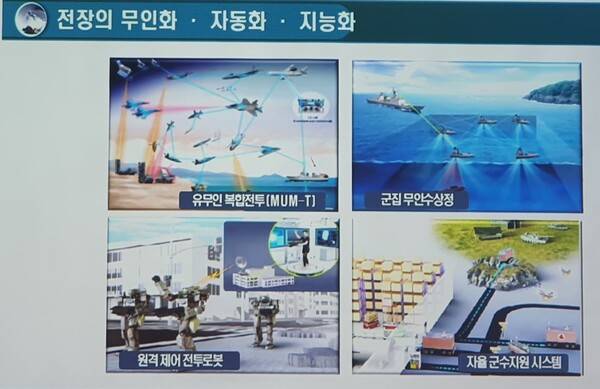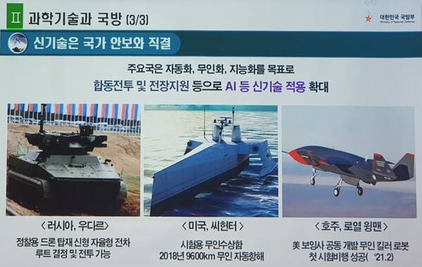 그는 "신기술은 국가 안보와 직결된다. 정찰용 드론 탑재 신형 자율형 전차인 러시아 우다르, 시험용 무인수상함 미국 씨헌터, 미국 보잉사 공동 개발 무인킬러 로봇 첫 비행 호주 로열 윙맨 등 주요국은 자동화, 무인화, 지능화를 목표로 합동전투 및 전장지원 등으로 AI 등 신기술 적용 확대한다"고 설명했다.