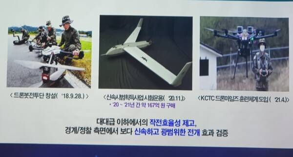 오 실장은 "2018년 드론전투단 창설, 2020년 신속시범획득사업 시험운용(20~21년 약 167억원 구매), KCTC 드론마일즈 혼련체계도입 등 대대급 이하에서의 작전 효율성 제고, 경계-종철 측면에서 신속하고 광범위한 전개 효과 검증하는 등 국방 활용을 확대중"이라고 말했다.