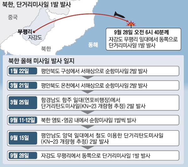 이날 합동참모본부는 "금일 오전 6시 40분께 북한 자강도 무평리 일대에서 동쪽으로 발사된 단거리미사일로 추정되는 발사체 1발을 포착했다"고 밝혔다. 이번 미사일 발사는 문재인 대통령이 종전선언을 제안한 뒤 북측에서 다소 긍정적으로 해석될 수 있는 반응이 연이어 나오던 중 이뤄진 터라 더욱 주목되고 있다.
