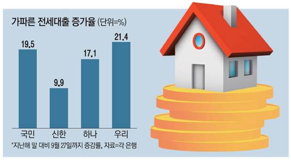 올 들어 시중은행 가계대출 증가를 이끌고 있는 것은 전세자금대출이다. 5대 은행에서 전세자금대출 잔액은 지난해 말 105조2127억원에서 올해 8월 말 119조9670억원으로 14%(14조7543억원) 늘어났다. 이는 같은 기간 전체 가계대출 증가액(28조6610억원)의 절반이 넘는 수준이다.