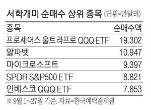 28일 한국예탁결제원에 따르면 해외 증시에 투자하는 서학개미의 순매수 상위 5개 종목 중 3개가 ETF인 것으로 집계됐다. 이달 1~27일 해외 증시 상장 종목 가운데 순매수액이 가장 큰 종목은 프로셰어스 울트라프로 QQQ ETF로 순매수액이 1억9302만달러(약 2283억원)에 이르렀다. 구글 모회사 알파벳(1억947만달러)보다 많은 금액을 담았다. 해당 ETF는 나스닥100지수를 3배로 추종하는 상품이다. 이달 들어서만 나스닥지수가 2% 이상 하락하자 저가 매수 기회로 판단해 사들이고 있는 것으로 풀이된다.