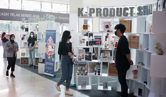 [서울=뉴시스] 홍효식 기자 = 무역협회와 코엑스가 주최하는 '자카르타 온-오프 한국상품 전시상담회'가 개막한 28일 오후 자카르타 현지 소비자들이 자카르타 롯데마트 내 조성한 홍보관을 방문해 우리 기업들의 제품을 살펴보고 있다. (사진=무역협회 제공) 2021.09.28. photo@newsis.com *재판매 및 DB 금지