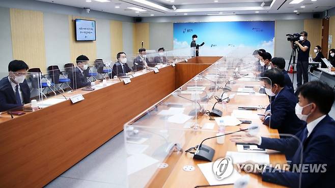 (서울=연합뉴스) 문승욱 산업통상자원부 장관(왼쪽 세 번째)이 28일 오후 경기도 용인시청에서 '용인 반도체 클러스터 진행상황 점검회의'에 참석해 인사말 하고 있다. 2021.9.28