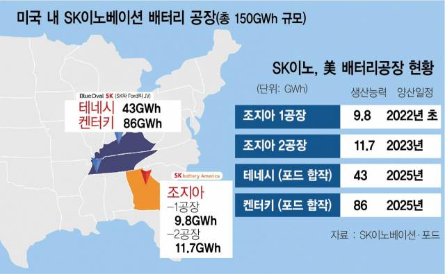 앞으로 양 사는 테네시주와 켄터키주에 배터리 공장을 건설한다. 테네시 공장은 포드의 전기차 생산 공장과 함께 들어서며 생산능력은 43기가와트시(GWh)다. 켄터키 공장은 각각 43GWh 2기(총 86GWh)로 건설될 예정이다. SK이노베이션 관계자는 “총 생산능력은 당초 계획했던 규모(60Gwh)에서 129GWh로 두 배 이상 늘어났는데 이는 매년 215만 대가량의 전기차를 생산할 수 있는 수준”이라며 “미국 역사상 최대 규모의 배터리 공장이 설립된다”고 설명했다. 조지아주에서 따로 짓고 있는 공장 두 곳과 합하면 미국에서만 약 150GWh의 생산능력을 확보해 현지 최대 배터리 업체로 발돋움하게 된다. 아울러 2025년까지 전 세계에서 200GWh의 생산능력을 확보하겠다는 목표도 초과 달성할 것으로 보인다.