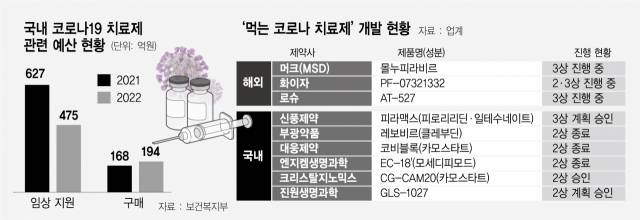 정부가 해외 치료제 구매에 힘을 쓰는 사이 국내 제약사들의 치료제 개발 지원은 오히려 줄었다. 보건복지부에 따르면 내년 치료제 구매 비용은 늘었지만, 임상 지원 예산은 475억 원으로 올해(627억 원) 보다 24.2% 축소됐다. 현재 국내 제약사 중에는 신풍제약(019170)의 '피라맥스'가 임상 3상을 승인받았으며 부광약품(003000)·대웅제약(069620)은 2상을 마쳤고, 진원생명과학(011000)·크리스탈지노믹스(083790) 등은 2상을 승인받았다. 코로나19 치료제를 개발 중인 한 제약사 관계자는 “해외에서 코로나 치료제 임상을 하려면 최대 피험자 1인당 1억 원까지 비용이 들어갈 정도로 비싸고, 국내에서는 코로나19 확진자 수가 적어 임상 피험자 모집 자체가 어렵다”며 “국내 제약사들도 책임감으로 치료제 개발을 이어가고 있지만 정부의 임상 지원은 부족하고, 구매는 글로벌 제약사가 우선이라 다소 힘이 빠지는 게 사실”이라고 토로했다.