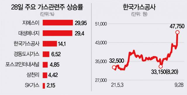 한국가스공사뿐 아니라 천연가스 관련주 대다수가 일제히 급등했다. 지에스이와 대성에너지는 이날 각 29.95%, 29.40% 오르며 상한가로 마감했다. 국내 1위 민간 도시가스 업체인 삼천리(004690)도 4.42% 올랐고 포스코인터내셔널(4.85%), SK가스(018670)(2.15%), 경동도시가스(267290)(6.52%) 등 다른 가스 관련주도 주가가 상승했다.