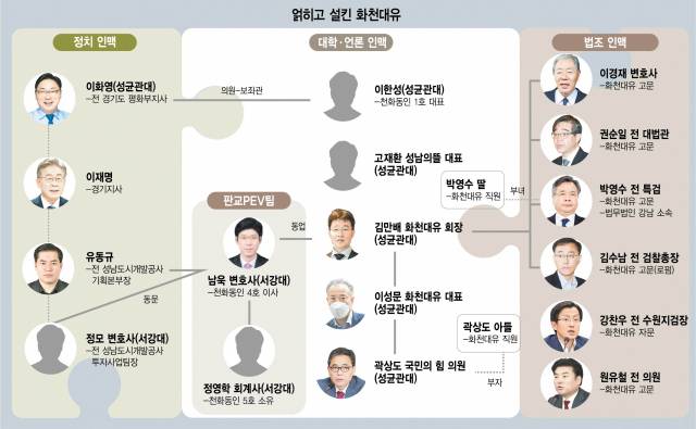 28일 정치권에 따르면 대장동 개발 시행사인 화천대유는 성균관대·서강대 출신이 두 축으로 포진한 가운데 각자의 인맥으로 지자체·정치권과 법조계로 뻗어나갔다.