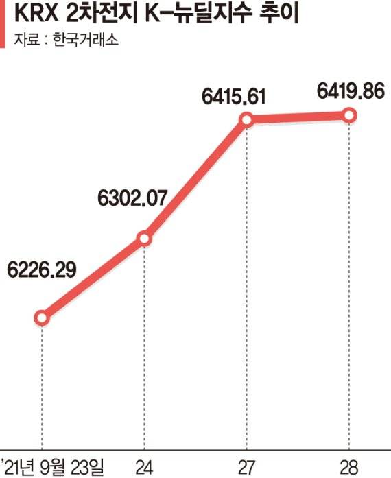반면 KRX 2차전지 K-뉴딜지수는 최근 4거래일 연속 상승하며 BBIG에서 유일하게 선방하고 있다. KRX 2차전지 K-뉴딜지수는 4거래일 동안 5.99% 상승한 6419.86을 기록했다.