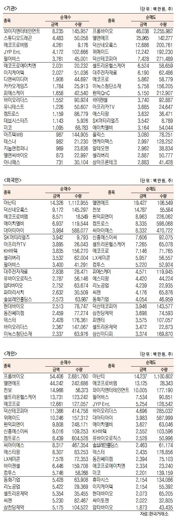 - [표]주간 코스닥 기관·외국인·개인 순매수·도 상위종목(9월 23~24일)