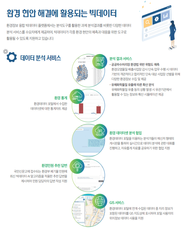 환경부와 소속·산하기관에 흩어져 있는 환경 데이터를 한 곳에 모아 누구나 쉽게 활용할 수 있는 정보로 재생산한다. 분석과제 발굴과 성과 확산을 통해 환경 데이터가 지원 될 수 있도록 하는 시스템이다.