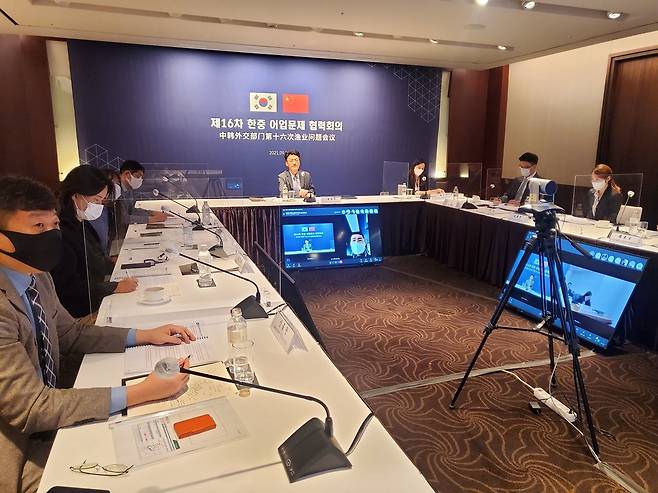 (서울=연합뉴스) 한국과 중국 정부가 어업 관련 현안을 논의하는 제16차 어업 문제 협력 회의를 28일 화상으로 개최했다고 외교부가 밝혔다. 사진은 한-중 어업 협력회의. 2021.9.28
