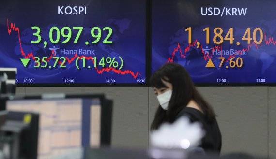 28일 증시에서 코스피는 전일에 비해 35.72포인트(1.14%) 하락한 3097.92로 마감됐다. 기관이 5554억원의 순매도를 기록하며 지수하락을 이끌었다. 외국인과 개인은 각각 92억원, 5602억원의 매수우위를 기록했다. 이날 외환시장에서 원·달러 환율은 전일보다 7.60원(0.65%) 오른 1184.40원으로 마감됐다.