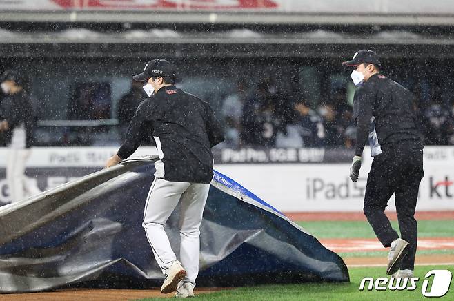 (수원=뉴스1) 김영운 기자 = 28일 오후 경기도 수원시 장안구 KT위즈파크에서 열린 ‘2021 신한은행 SOL KBO리그’ KT 위즈와 두산 베어스의 경기가 우천으로 인해 중단되고 있다. 2021.9.28/뉴스1