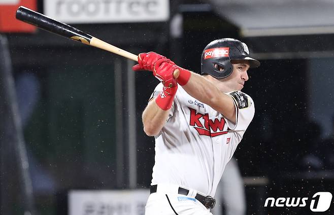 (수원=뉴스1) 김영운 기자 = 28일 오후 경기도 수원시 장안구 KT위즈파크에서 열린 ‘2021 신한은행 SOL KBO리그’ KT 위즈와 두산 베어스의 경기, 1회말 1사 만루 KT 호잉이 안타를 치고 있다. 2021.9.28/뉴스1