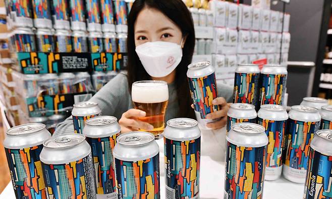 28일 서울 등촌동 홈플러스 강서점에서 모델이 스페인 직수입 발포주 ‘산타 마리아’를 선보이고 있다. 이 맥주는 출시를 기념해 다음달 27일까지 전국 홈플러스와 홈플러스 익스프레스 매장에서 500㎖들이 한 캔당 1000원에 판매된다.