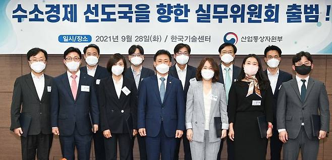 [서울=뉴시스] 홍효식 기자 = 박기영 산업통상자원부 2차관이 28일 오후 기술센터 대회의실에서 열린 수소경제 실무위원회 출범식에 참석해 위원들에게 위촉장을 수여한 뒤 기념촬영을 하고 있다. (사진=산업통상자원부 제공) 2021.09.28. photo@newsis.com *재판매 및 DB 금지
