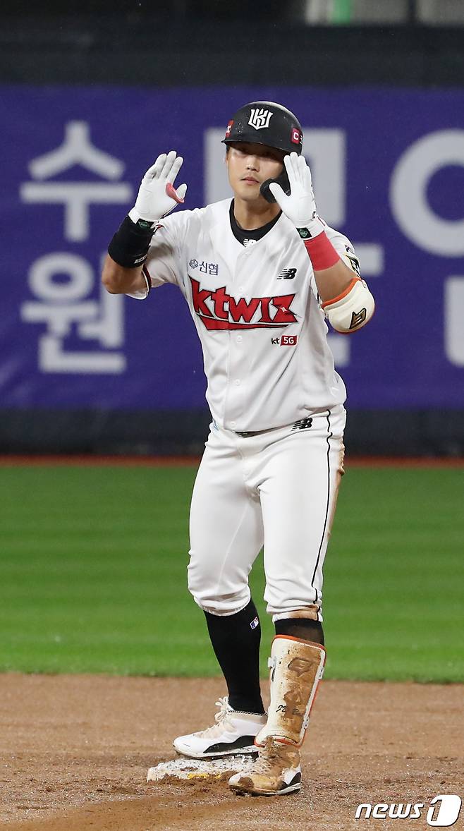 (수원=뉴스1) 김영운 기자 = 28일 오후 경기도 수원시 장안구 KT위즈파크에서 열린 ‘2021 신한은행 SOL KBO리그’ KT 위즈와 두산 베어스의 경기, 6회말 2사 KT 배정대가 안타를 치고 2루로 들어서고 있다. 2021.9.28/뉴스1