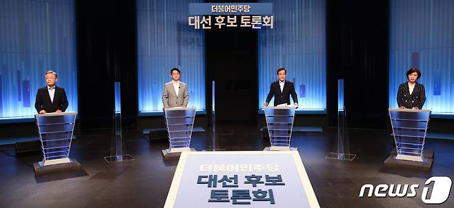 (서울=뉴스1) 국회사진취재단 = 더불어민주당 대선 경선 후보들이 28일 서울 목동 SBS에서 열린 더불어민주당 제20대 대선 후보 TV토론에 참석해 리허설 준비를 하고 있다. 왼쪽부터 이재명, 박용진, 이낙연, 추미애 후보. 2021.9.28/뉴스1