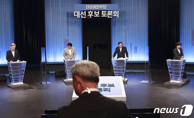 (서울=뉴스1) 국회사진취재단 = 이재명(왼쪽부터), 박용진, 이낙연, 추미애 더불어민주당 대선 경선 후보가 28일 오후 서울 양천구 목동 SBS에서 열린 TV 토론회를 준비하고 있다. 2021.9.28/뉴스1