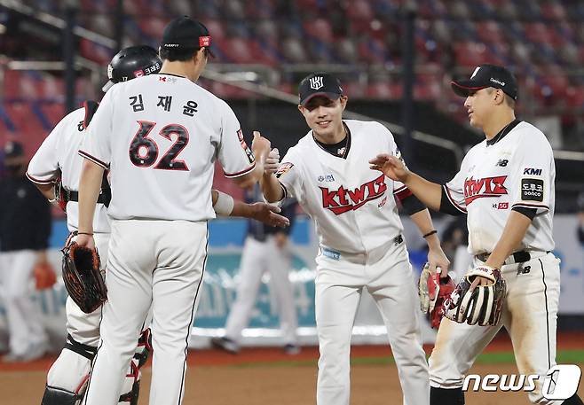 (수원=뉴스1) 김영운 기자 = 28일 오후 경기도 수원시 장안구 KT위즈파크에서 열린 ‘2021 신한은행 SOL KBO리그’ KT 위즈와 두산 베어스의 경기 종료 후 KT 선수들이 기쁨을 나누고 있다. 이날 경기는 5대1로 KT의 승리로 끝났다. 2021.9.28/뉴스1