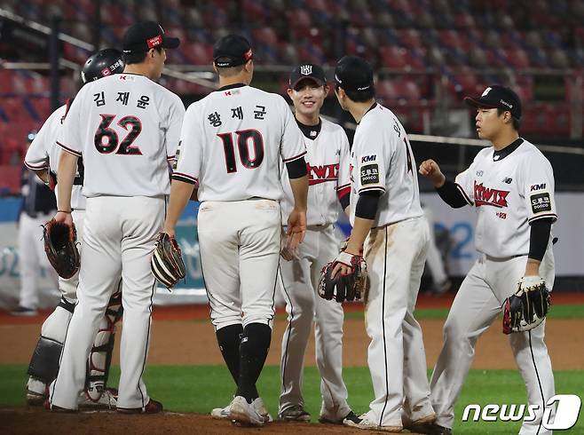 (수원=뉴스1) 김영운 기자 = 28일 오후 경기도 수원시 장안구 KT위즈파크에서 열린 ‘2021 신한은행 SOL KBO리그’ KT 위즈와 두산 베어스의 경기 종료 후 KT 선수들이 기쁨을 나누고 있다. 이날 경기는 5대1로 KT의 승리로 끝났다. 2021.9.28/뉴스1