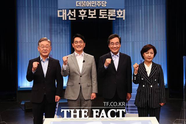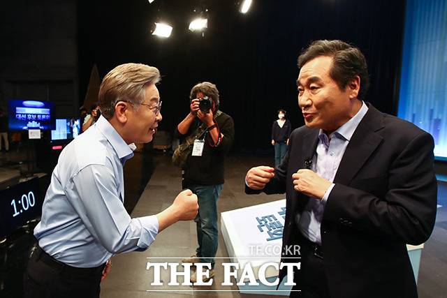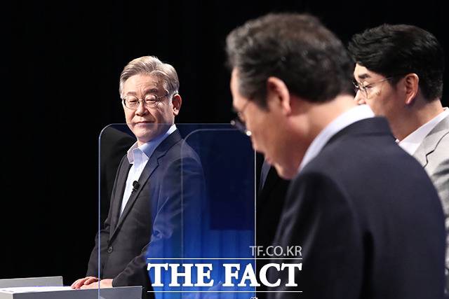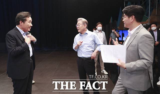 [더팩트ㅣ국회사진취재단] 더불어민주당 대선 경선 후보인 이재명 전 경기지사(왼쪽)와 이낙연 전 대표가 28일 오후 서울 양천구 목동 SBS에서 열린 TV토론회에 참석해 토론을 갖고 있다.