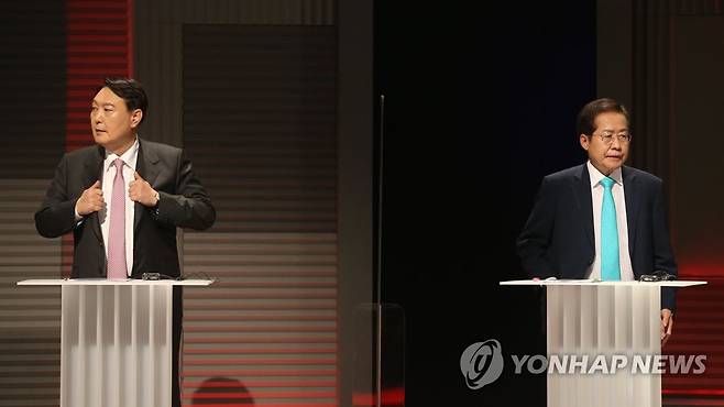 (서울=연합뉴스) 국민의힘 윤석열(왼쪽), 홍준표 대선 경선 예비후보가 28일 서울 상암동 MBC에서 열린 대선 경선 예비 후보자 4차 방송토론회에서 방송 준비를 하고 있다. 2021.9.28 [국회사진기자단]