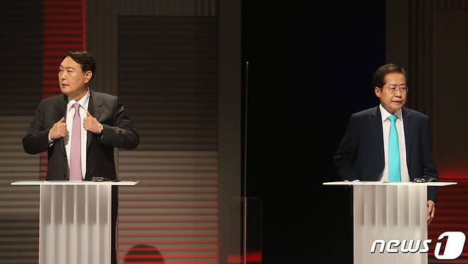(서울=뉴스1) 국회사진취재단 = 국민의힘 윤석열 대선 예비후보와 홍준표 예비후보가 28일 오후 서울 마포구 MBC 신사옥에서 열린 '100분 토론' 생방송에 앞서 준비를 하고 있다. 2021.9.28/뉴스1