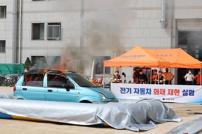 [서울=뉴시스] 홍효식 기자 = 28일 서울 도봉구 도봉소방서에서 소방대원들이 전기 자동차 화재 재현 실험을 진행하고 있다. (사진=도봉소방서 제공) 2021.09.28. photo@newsis.com *재판매 및 DB 금지