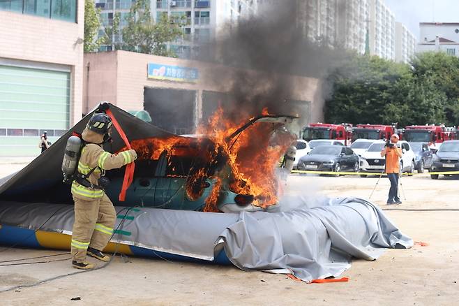 [서울=뉴시스] 홍효식 기자 = 28일 서울 도봉구 도봉소방서에서 소방대원들이 전기 자동차 화재 재현 실험을 진행하고 있다. (사진=도봉소방서 제공) 2021.09.28. photo@newsis.com *재판매 및 DB 금지