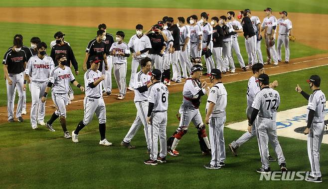 [서울=뉴시스] 정병혁 기자 = 28일 오후 서울 송파구 잠실야구장에서 열린 2021 신한은행 SOL KBO리그 롯데 자이언츠와 LG 트윈스의 경기, 5대 2로 승리한 LG 선수들이 기뻐하고 있다. 2021.09.28. jhope@newsis.com