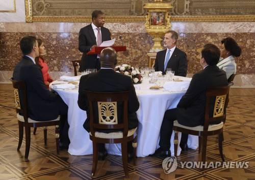 epa09492863 Angola's president Joao Manuel Goncalves Lourenco (c) gives a speech next to Spanish King Felipe VI (R), Queen Letizia (L), Prime Minister Pedro Sanchez (2L) and his wife Ana Afonso Dias Lourenco (R) during the official lunch held at the Royal Palace in Madrid, Spain, 28 September 2021. EPA/Ballesteros