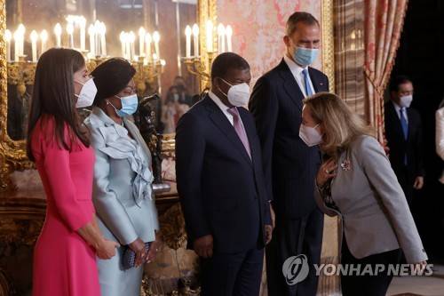 epa09492869 Deputy Prime minister and Economy Minister Nadia Calvino (R) greet Spanish King Felipe VI (2R), Queen Letizia (L) Angola's president Joao Manuel Goncalves Lourenco (c) and his wife Ana Afonso Dias Lourenco (2L) before the official lunch held at the Royal Palace in Madrid, Spain, 28 September 2021. EPA/Ballesteros