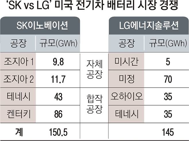 LG에너지솔루션과 미국 제너럴모터스(GM)의 합작법인 ‘얼티엄셀스’가 짓는 오하이오·테네시 공장 규모는 70GWh다. LG에너지솔루션은 앞으로 5조원을 투자해 2025년까지 기존 미시간 공장 5GWh를 포함해 미국 내 자체 생산규모를 75GWh까지 늘리기로 했다. 모두 더하면 145GWh로, 현재 계획상으론 SK이노베이션보다 5.5GWh 적은 규모다.