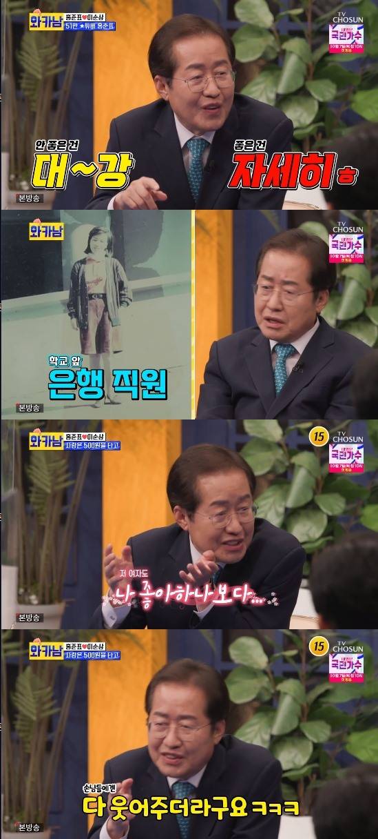 이날 홍준표는 '와카남'을 찾아 MC들에게 "하고 싶은 말 다 해도 된다"면서 방송 자신감을 드러냈다. 박명수는 과거 홍준표와의 인연을 언급하면서 "당시에 비싼 양주를 선물로 주셨었다"고 했다. 하지만 홍준표는 술을 많이 마시지 않는다고. 이에 대해 홍준표는 "제가 대학생 때 아버지가 술병으로 돌아가시는 것을 보고 술은 많이 마시면 안된다는 생각을 하게 됐다. 그래서 그 이후로는 어떤 술이든 2잔 이상은 마시지 않는다"고 말했다.