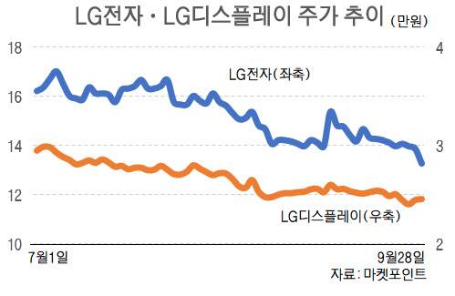 LG디스플레이 역시 지난 7월 이후 주가가 20% 이상 빠졌다. TV 수요 둔화로 인한 액정표시장치(LCD) 패널 가격 하락으로 실적 예상치가 하향됐기 때문이다. 지난 6월 32인치 패널부터 시작된 가격 하락이 9월에는 초대형 패널로까지 번졌다. 상대적으로 패널 가격이 비싼 유기발광다이오드(OLED)의 수익성이 개선되고 있지만 LCD 판가 하락으로 인한 타격이 더 큰 상황이다. 이달 들어 케이프투자증권을 포함한 5곳의 증권사가 LG디스플레이 목표가를 하향했다.