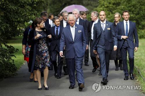 Britain's Prince Charles, center, walks with Chair of Trustees Amelia Fawcett, left, during a visit to the Royal Botanic Gardens Kew,, south west London, Tuesday Sept. 28, 2021. (Peter Nicholls/Pool via AP) POOL