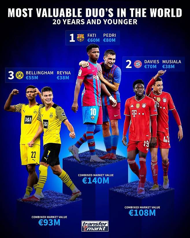 1위는 바르사의 미래이자 현재 안수 파티와 페드리 콤비가 차지했다. 각각 6,000만 유로와 8,000만 유로인 두 선수의 몸값을 다 합치면 1억 4,000만 유로(약 1,940억 원)다.