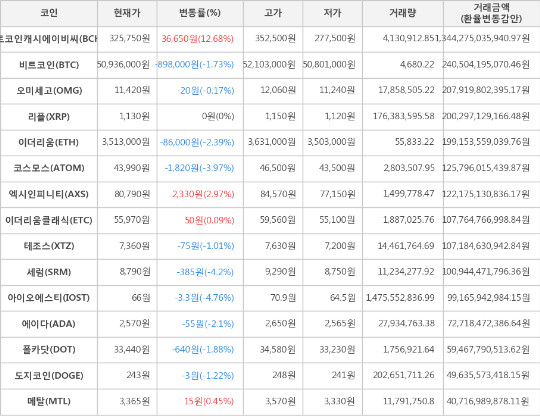 가상화폐 비트코인 -898,000원 하락한 50,936,000원에 거래
