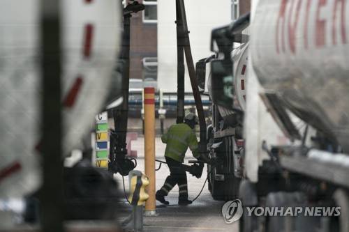 Fuel tankers are filled at the Valero Manchester Terminal, in Manchester, England, Tuesday, Sept. 28, 2021. Thousands of British gas stations have run dry, as motorists scrambled to fill up amid a supply disruption due to a shortage of truck drivers. Long lines of vehicles formed at many gas stations over the weekend, and tempers frayed as some drivers waited for hours. (AP Photo/Jon Super)