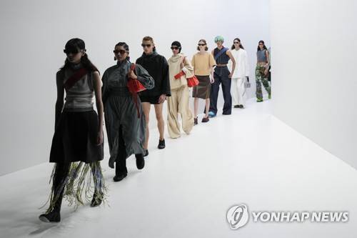 Models wear creations for the Sunnei Spring Summer 2022 collection during Milan Fashion Week, in Milan, Italy, Friday, Sept. 24, 2021. (AP Photo/Antonio Calanni)